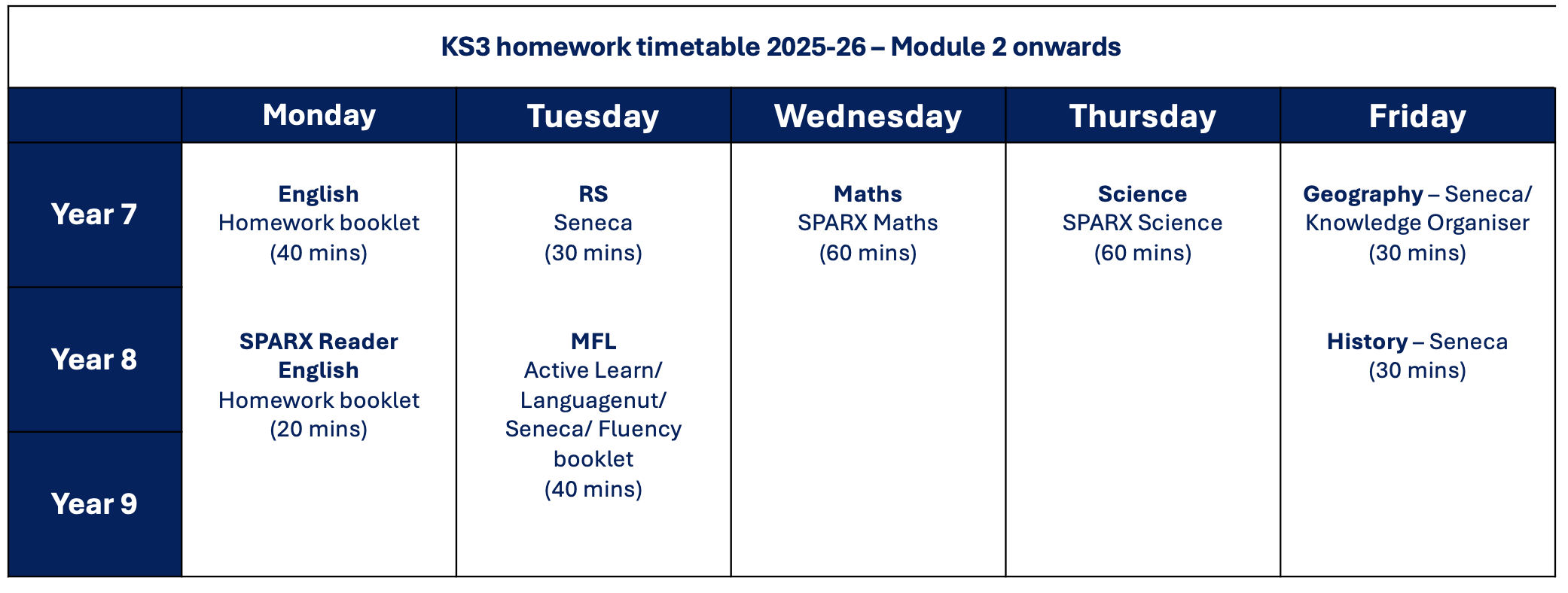 **In addition to following this homework timetable, some of your other subjects will set additional homework. Please check SMHW for more details.